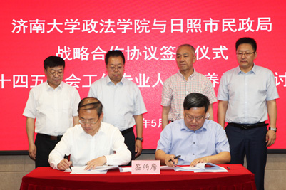 5月31日,政法学院与日照市民政局战略合作协议签约仪式暨十四五社会工作专业人才培养学术研讨会在济南举行。学校副校长刘宗明,山东省民政厅慈善事业促进和社会工作处三级调研员王建武,日照市民政局党组书记、局长王录联,日照市民政局党组成员、副局长丁志强,日照市财政局、各县(区)民政局、社区发展服务中心负责同志和政法学院师生代表参加了活动。
