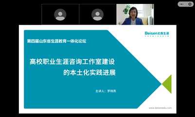 北森生涯咨询产品总监罗晓燕作《高校职业生涯咨询工作室建设的本土化实践进展》经验分享,她基于生涯教育政策导向变化,围绕生涯咨询室本土化的实践调研和本土化解决方案两大板块进行了详细介绍,提出了包括基础建设、师资培养、运营管理、资源统筹的咨询室建设常规过程和各阶段的典型特征,为进一步建设有特色的职业生涯咨询工作室提供了科学的方法和思路。永利yl23411官网学生生涯发展指导中心主任张晶作《基于在校经历的大学生生涯规划指导模式——以永利yl23411官网为例》的经验分享,他结合生动鲜活的实践案例提出“在校经历”的重要性,以学生工作实践为依据提出在校经历的类别划分、发展维度和打造途径,引出目标驱动(经典生涯规划框架)、任务驱动(生涯发展五阶段)、方向驱动(生涯模式四分类)三大生涯发展建构模式,并分享基于“在校经历”的生涯指导方法和工作领域,为学生生涯发展指导提供了新的视角。山东省实验中学东校升学指导中心主任高良元作《以生涯教育为抓手助推学生多元发展》的报告,他从高中生涯教育课程建设、生涯指导课程活动体系、相关的探讨与需求等三个方面介绍了多元化促进高中学生生涯发展的工作思路、具体做法和实践经验,是新高考改革之后实现高高(高中-高校)衔接的有效途径。青岛大学学生生涯发展指导中心主任李莹分享《“以学生为中心”—高校生涯教育心得》,李老师围绕“以学生为中心”的核心目标,从对学生可操作、有实效的内容建设到让学生喜欢听、愿意用的呈现形式,介绍了学校的实践经验和特色做法,提出了学校的1234+生涯规划与就业指导工作体系,为高校生涯课程建设提供了新思路。山东中医药大学招生就业处副处长、大学生就业指导中心主任刘同国作《高质量培训,精准化指导,推进宏志助航计划顺利实施》的报告,他围绕宏志助航计划和工作实际,详细介绍了“四到位”组织高质量培训,“四抓实”开展精准化指导的培训模式,并课程内容体系、培训组织、资源整合等方面提供了科学性建议。