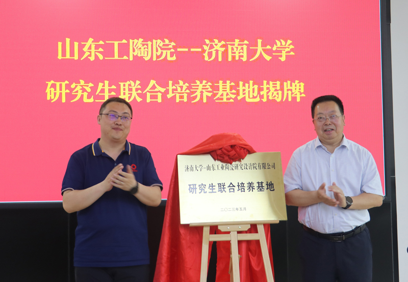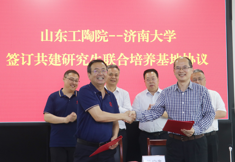 研究生院院长孙国新与山东工陶院党委委员、副董事长程之强签订共建研究生联合培养基地协议,刘宗明校长与彭雪飞书记共同为研究生联合培养基地揭牌,黄加栋副校长为山东工陶院联合培养导师颁发证书。