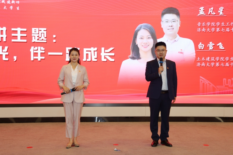 优秀校友、辅导员、大学生紧紧围绕习近平新时代中国特色社会主义思想和党的二十大精神,紧密结合专业学习经历和个人成长阅历,以新时代青年人的叙述视角和叙述方式,分别讲述自己的奋斗故事、育人故事和成长故事。学校优秀校友、商学院2005届毕业生张维以《我的青春在奋斗》为题,从在母校的经历谈起,讲述自己得益于党和国家好政策投身乡村振兴创建“乡约菜菜”——小农户涉农公益服务平台的故事,呼吁广大青年学生将自己的未来与党和国家的命运紧密相连,将论文写在祖国的大地上。学校十佳辅导员白雪飞、孟凡星以《化一缕微光,伴一路成长》为题,通过回顾一个又一个感人至深的育人故事,重温15年间家访育人的灼灼之光,发出“我们为青年护航的日日夜夜,也与青年一同成长;学生的需求与信赖,是我们坚定前行的不竭动力”的辅导员誓言。 宋健奖学金获得者、已推免至天津大学继续读研的化学化工学院学生王佳俊以《做一支有思想的芦苇》为题,讲述自己是如何从乡村少年成长为科研小将的故事,愿做一支有思想的芦苇,在创新报国的道路上努力前行。济大繁星获得者、已考取拔尖选调生的生物科学与技术学院学生张佳馨以《扎根基层沃土 倾情奉献青春》为题,讲述自己从“身”入基层到“心”入基层的故事,愿扎根在一线、磨砺在一线,以百姓心为心,以群众暖为暖。退役复学大学生政法学院杨润泽以《一声“到” 一生“到”》为题,讲述自己参军入伍成为一名仪仗兵、返校后退役不褪色的成长经历,发出“愿以吾辈之青春,捍卫盛世之中华,继革命之精神,乘时代之洪波,在实现强军兴军的伟大实践中,书写‘请党放心,强国有我’的青春篇章”的青春誓言。