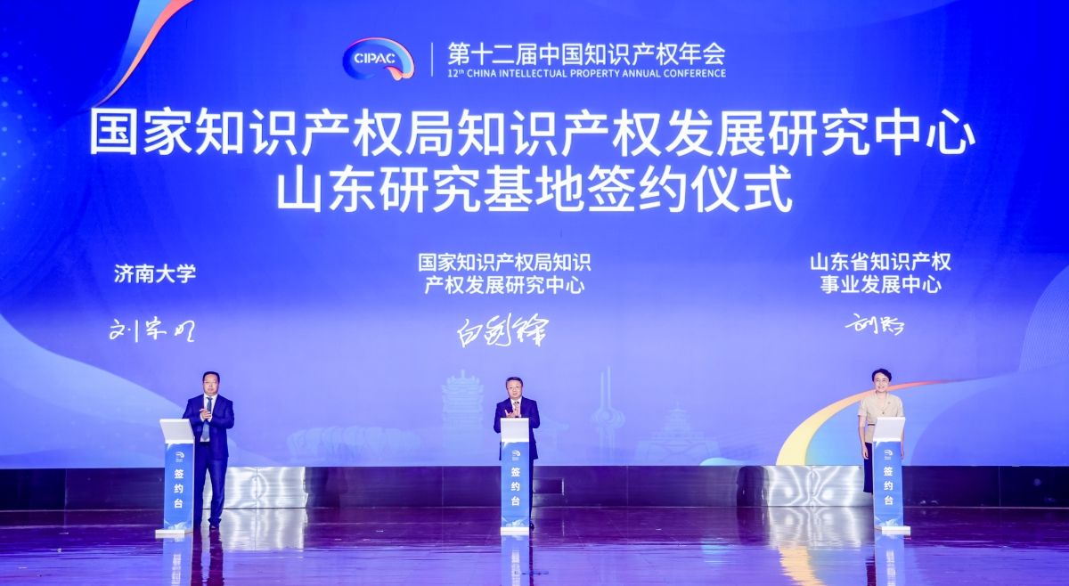 会上,举行了国家知识产权局知识产权发展研究中心山东研究基地签约仪式,刘宗明校长与国家知识产权局知识产权发展研究中心主任白剑锋、山东省知识产权事业发展中心主任刘路共同签约。