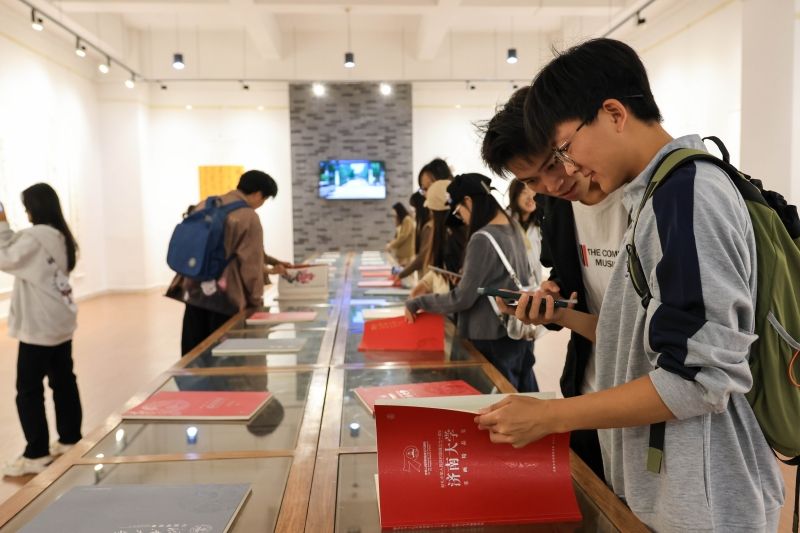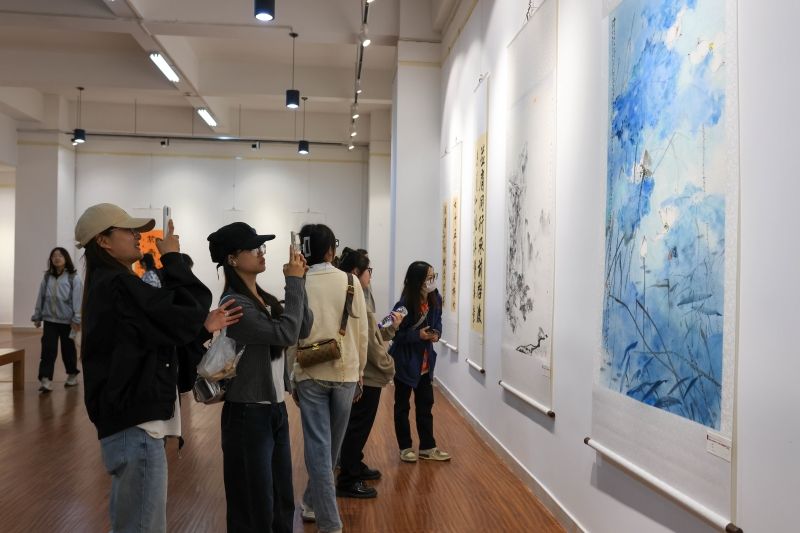 开幕式结束后,学校领导、师生代表共同进入展馆参观。本次书画展展出的作品风格多样,意境悠远,大家在每幅展品前驻足留步,细心观赏,感受师生们对祖国和学校的深情祝福。