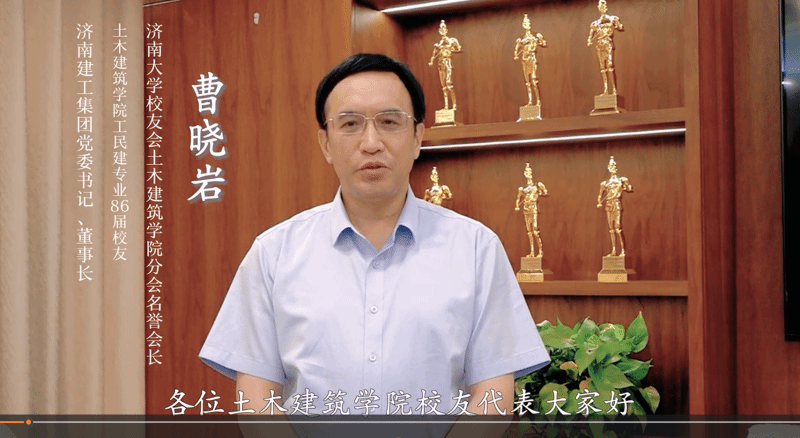 校友会名誉会长、济南建工集团党委书记、董事长、86届校友曹晓岩通过视频方式祝贺校友会成立,表示定将与校友共同努力,为母校和学院的发展增光添彩;与校友并肩携手,共同发展,以校友发展促进母校发展。