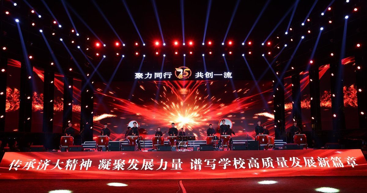 晚会以“聚力同行·共创一流”作为主题,分为“济大你好”“礼赞山河”“鼎新逐梦”三个篇章。开场节目鼓乐《龙腾虎跃》,以铿锵有力的表演点燃了现场观众的热情。