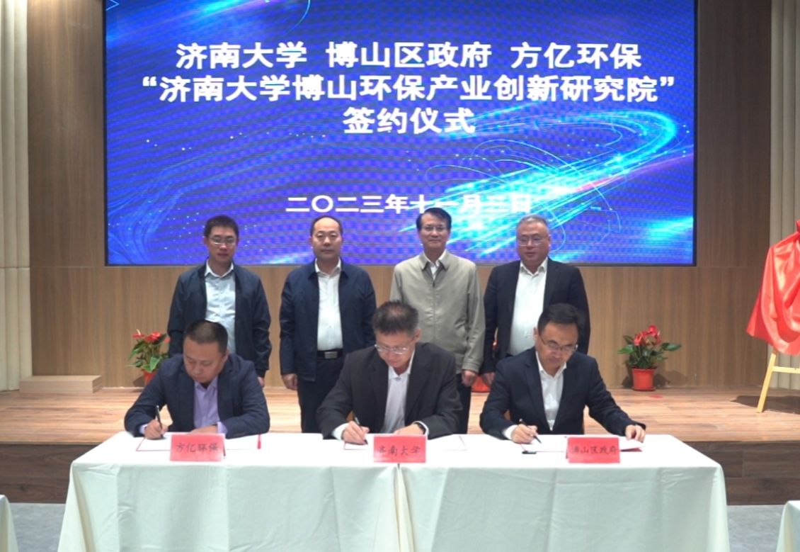 仪式上,学校合作发展处处长刘振,博山区委常委、副区长宋传伟,山东方亿环保有限公司总经理朱家斌共同签署了共建“永利yl23411官网博山环保创新研究院”协议。曾宪文、朱玉友、黄加栋、朱家斌共同为研究院揭牌。