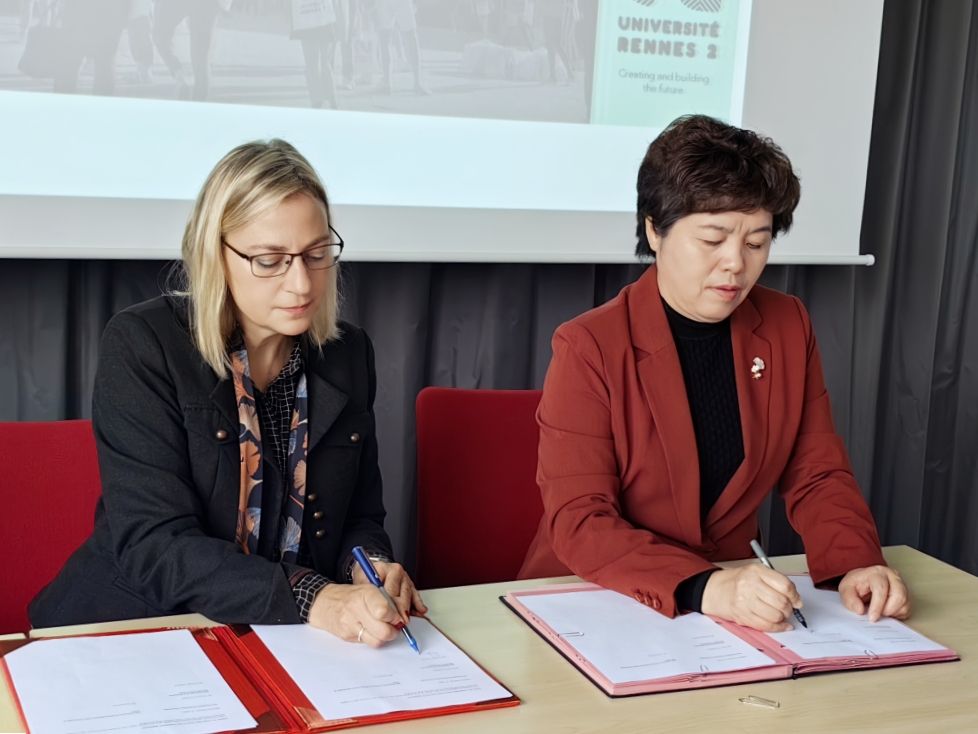 在雷恩二大,代表团与副校长埃德维热(Edwinge Fusaro)及语言系、应用外语系、社会及经济管理处相关负责人会谈,法国布列塔尼大区驻山东总代表柯妮女士参加会谈。会上双方共同回顾了自建立友好合作关系以来在本科学生交流互访方面取得的成绩,并就未来多层次学生交流、科研合作领域进行深入探讨。座谈结束后,双方续签了《永利yl23411官网与雷恩二大友好合作备忘录》《永利yl23411官网与雷恩二大学生交流协议》。