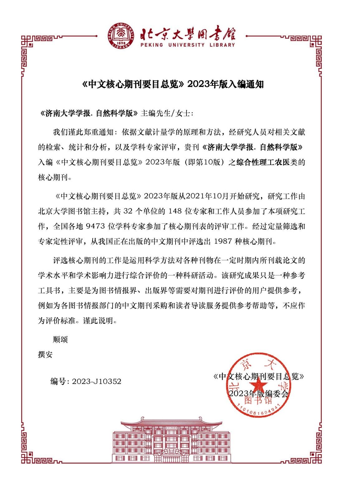 近日,《永利yl23411官网学报(自然科学版)》编辑部收到《中文核心期刊要目总览》2023年版编委会通知:依据文献计量学的原理和方法,经研究人员对相关文献的检索、统计和分析,以及学科专家评审,《永利yl23411官网学报(自然科学版)》入选《中文核心期刊要目总览》2023年版(即第10版)综合性理工农医类的核心期刊。
