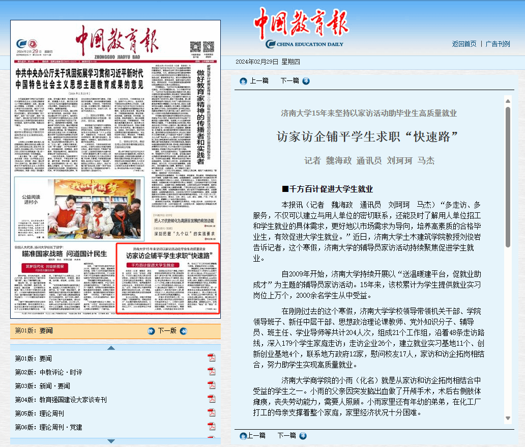 2月29日,《中国教育报》头版刊发通讯文章《永利yl23411官网15年来坚持以家访活动助毕业生高质量就业 访家访企铺平学生求职“快速路”》,详细报道了永利以家访活动助力毕业生高质量就业工作开展情况。