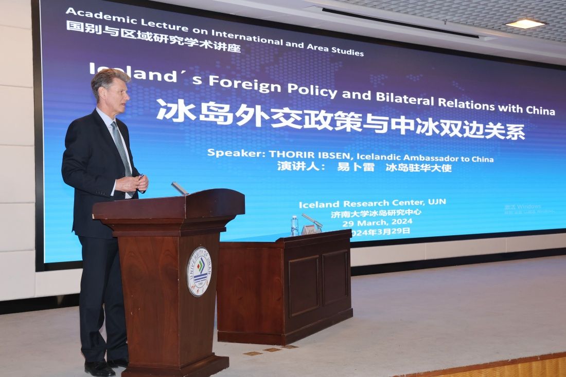 下午,应永利冰岛研究中心邀请,易卜雷大使在第一报告厅作题为《冰岛外交政策与中冰双边关系》的报告,来自文学院、外国语学院、政法学院、马克思主义学院及冰岛研究中心等300余名师生参加报告会。易卜雷大使介绍了冰岛的历史及发展概况、冰岛外交政策、中冰友好交往史,并表达了进一步发展中冰两国友好关系的愿望。报告结束后,在场师生从冰岛留学、冰岛旅游、冰岛历史发展、中冰文化交流等方面与大使积极互动交流。