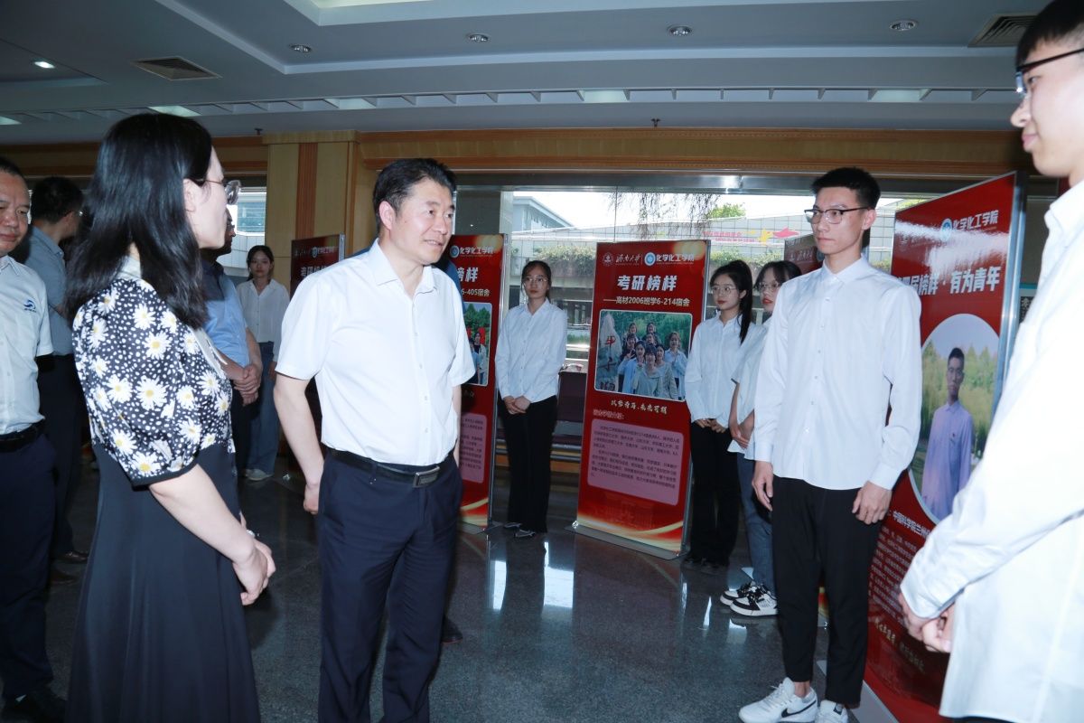 表彰大会前,领导嘉宾参观了化学化工学院第四届“榜样·有为青年”优秀学生事迹展,并与榜样团成员代表进行了亲切交流。