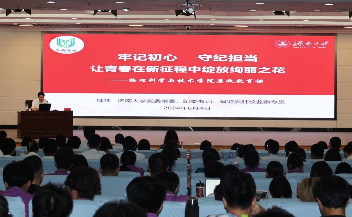 为深入学习领会习近平总书记关于党纪学习教育的重要讲话和重要指示精神,进一步推进党纪学习教育走深走实,教育引导广大师生涵养自律精神,教育毕业生党员扣好廉洁的“第一粒扣子”。6月4日,学校党委常委、纪委书记、省监委驻永利yl23411官网监察专员续铁以《牢记初心守纪担当,让青春在新征程中绽放绚丽之花》为主题,在第一学术报告厅为物理科学与技术学院学生党员、入党积极分子讲授党纪学习教育暨毕业生廉洁教育专题党课,党课由学院党委书记丛菡菡主持。