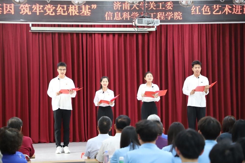 活动开始前,学校关心下一代工作委员会秘书长、离退休工作处处长高卫红和信息科学与工程学院党委书记夏卫东分别致辞,介绍了活动背景、活动目的和意义。活动在经典红色朗诵《孔繁森之歌》中拉开帷幕,朗诵者声情并茂的讲述了“青山处处埋忠骨,一腔热血洒高原”孔繁森的感人事迹。随后,济南市朗诵艺术家协会主席华青等十余位校内外老艺术家、老教师带来了《英雄本色》《我是共产党员我没有忘记》《一双布鞋和满坡的迎春花》《人生岁月》等红色经典文艺作品,讲述了以“失踪”33年的志愿军战士柴云振为代表的革命先烈的英雄事迹。永利yl23411官网原工会主席张洪安创作的《济大的秋天》深情讲述了学校建校75周年艰辛光荣的发展历程,表达了学校全体师生争创“一流”的坚定决心和信心。信息科学与工程学院廉扬等学生党员的诗朗诵《廉洁颂》则向党组织表达了新时代青年坚守初心使命、铭记修身立德的郑重承诺。信息科学与工程学院组织员李童童以一首《又唱浏阳河》将现场气氛带到高潮,现场气氛热烈,掌声阵阵。最后,文艺展演在全体党员齐声合唱《歌唱祖国》中落下帷幕。