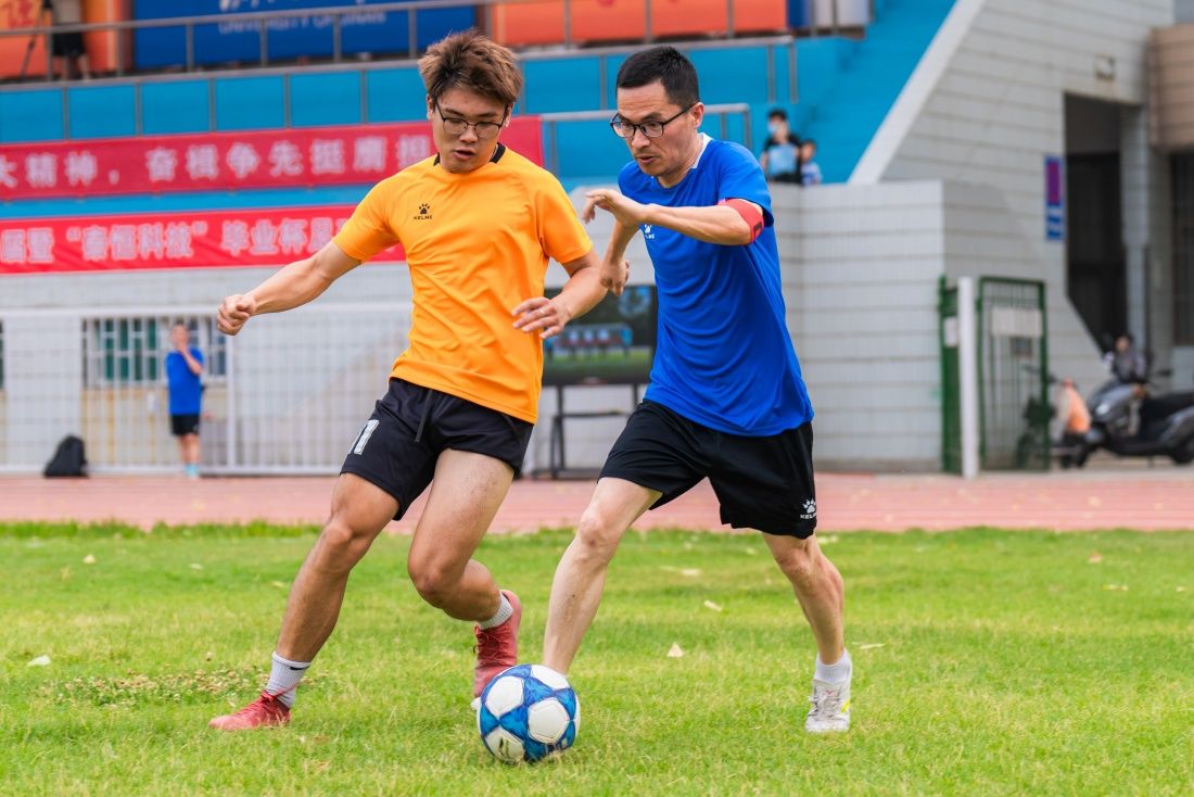 裁判一声哨响,刘宗明校长和程新教授为第39届毕业杯足球赛开球,足球友谊赛拉开序幕。绿茵场上,老师们精准的脚法、娴熟的技术、出色的防守、默契的配合不时赢来现场观众的热烈掌声和阵阵喝彩,同学们积极的跑动、强悍的进攻、巧妙的传球、灵活的跑位,彰显了青年学子青春活力、积极进取的拼搏精神。师生代表队你来我往,互有攻防,比赛动人心弦,高潮迭起,精彩纷呈。最终教师代表队以5:3的比分胜出。比赛结束后,同学们自发站成一排向老师们鞠躬致谢,师生握手拥抱,互道珍重祝福。