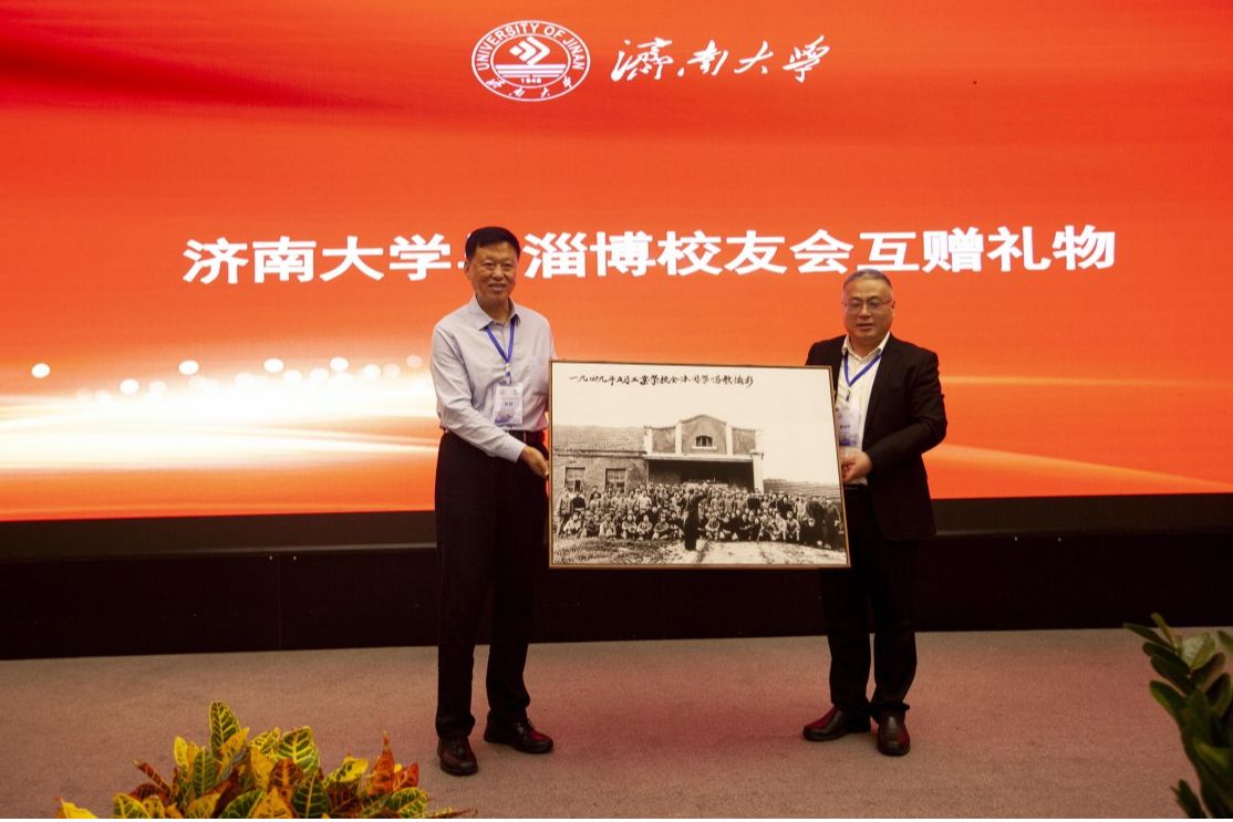 黄加栋代表学校向淄博校友会赠送1949年5月在学校博山老校区办公楼前的大合唱照片的扩印照,张斌代表淄博校友会向母校回赠淄博琉璃工艺品。礼物互赠寄托了母校和淄博校友会共同发展的美好期许。最后,大会在全体人员起立共唱永利yl23411官网校歌中圆满结束。