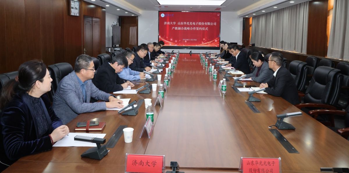 11月19日,学校与山东华光光电子股份有限公司产教融合战略合作签约仪式在学校第一会议室举行。学校党委副书记、校长刘宗明,党委常委、副校长黄加栋,山东华光光电子股份有限公司党委书记、董事长吴德华,党委委员、副总经理杜军军出席签约仪式。山东华光光电子股份有限公司技术研发部、人力资源部、综合管理部、融合业务部,学校合作发展处、教务处、科技处、材料科学与工程学院、物理科学与技术学院相关负责同志参加活动,签约仪式由黄加栋主持。