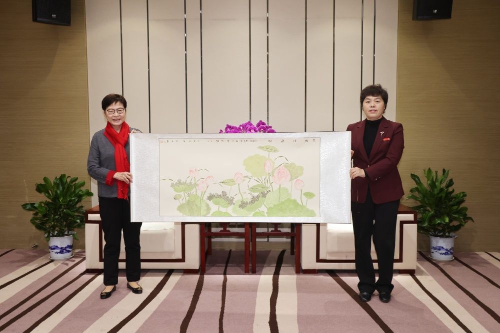 座谈会上,刘春华代表学校向林郑月娥女士赠送了永利美术与设计学院青年教师的国画作品《荷风清幽图》。