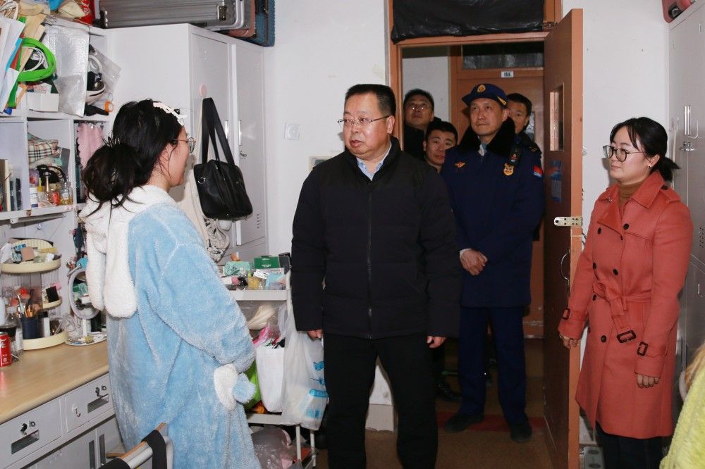 为贯彻落实全省学校安全工作视频会议精神,确保寒假期间校园的安全稳定,1月11日,学校党委副书记、校长刘宗明,党委常委、副校长李强带队开展寒假校园安全隐患专项检查,督导假期留校师生服务保障工作,检查工作还邀请了济南市市中区消防大队王璐队长给予指导。