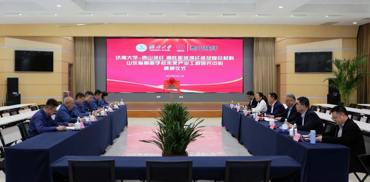 4月12日,“高性能玻璃纤维及复合材料山东省高等学校未来产业工程研究中心”揭牌仪式在泰山玻璃纤维有限公司(以下简称泰山玻纤)会议室举行。泰山玻纤党委书记、董事长呼跃武,党委副书记、总经理刘利锋及企业全体高层领导,永利yl23411官网党委副书记、校长刘宗明,党委常委、副校长黄加栋,科技处、材料科学与工程学院主要负责同志参加仪式,仪式由泰山玻纤党委副书记吴龙主持。