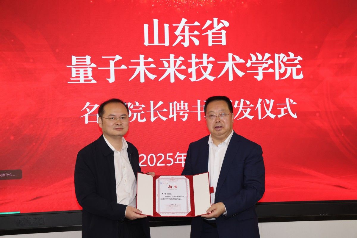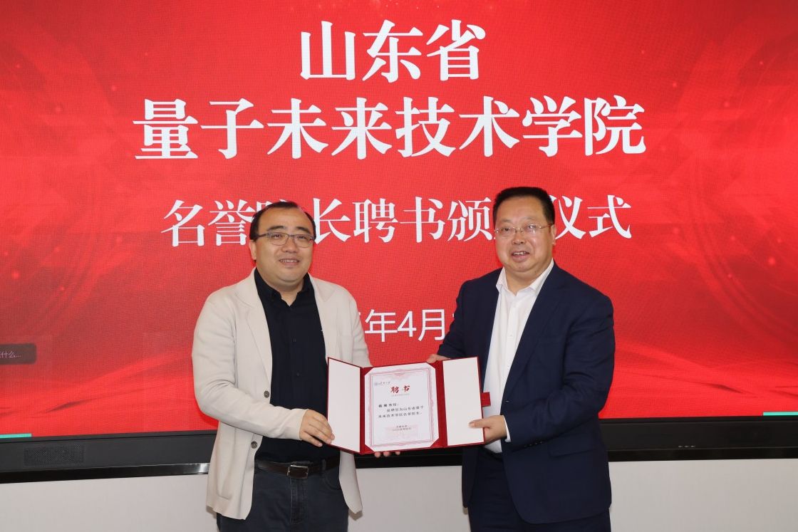 刘宗明为张强颁发山东省量子未来技术学院名誉院长聘书,为周飞颁发兼职副院长聘书。
