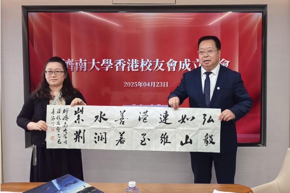 刘宗明向香港校友会副会长、2009届制药工程专业校友、环境与生物分析国家重点实验室(香港浸会大学)科学主任向丽授予永利yl23411官网香港校友会会旗,并代表学校校友会向香港校友会赠送贺礼,表达对香港校友会成立的祝贺及未来发展的殷切期望。