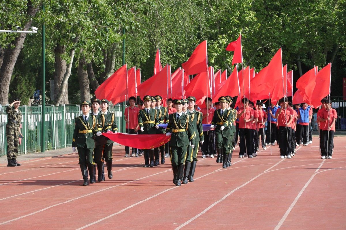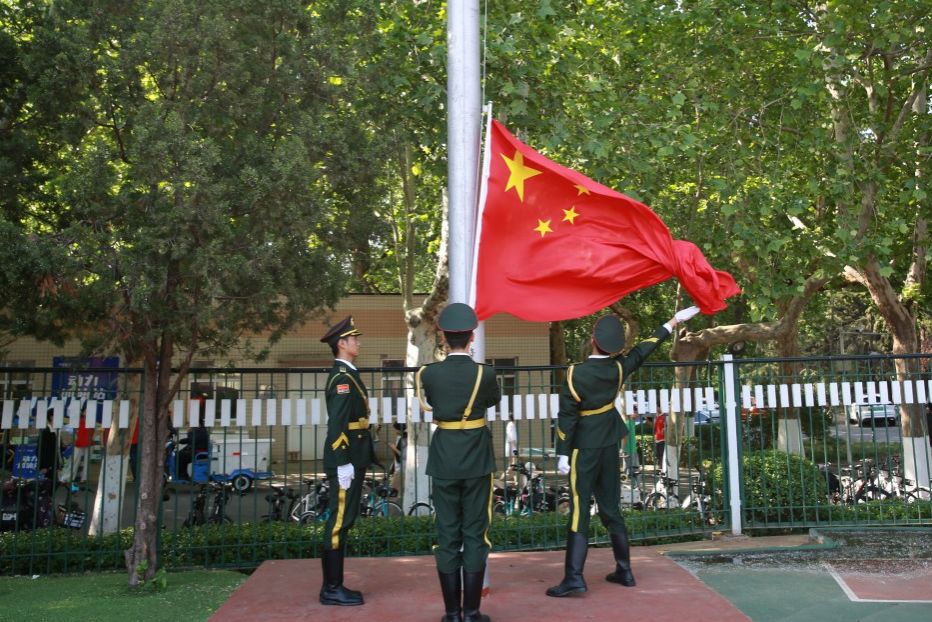 在雄壮的国歌声中,鲜艳的五星红旗在运动场上空升起。
