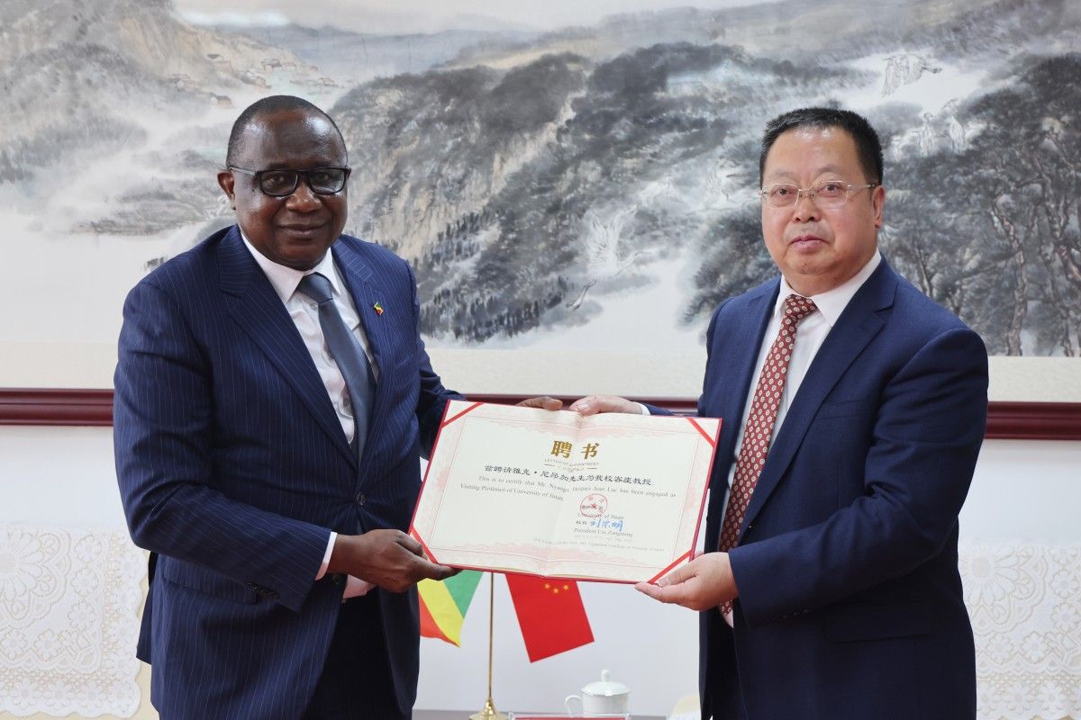 刘宗明对大使一行来访表示热烈欢迎,他简要介绍了学校发展情况及刚果共和国留学生教育工作情况,回顾了永利与马利安·恩古瓦比大学共建孔子学院近年来在国际中文教育领域所取得的合作成果。同时介绍了永利yl23411官网非洲研究中心近年来在拓展对非洲国家和地区合作交流方面所开展的研究工作。他表示,雅克·尼昂加大使到任后首次访问山东,第一站即到访永利yl23411官网,既体现了大使对刚果共和国与山东省合作的高度重视,也体现了对马利安·恩古瓦比大学与永利yl23411官网长期交流合作的认可,希望大使先生及刚果共和国驻华使馆一如既往支持永利yl23411官网,共同推动双方在青年、人文、教育科研等领域的交流互访,增进互利合作。随后,刘宗明向雅克·尼昂加大使颁发荣誉教授聘书。