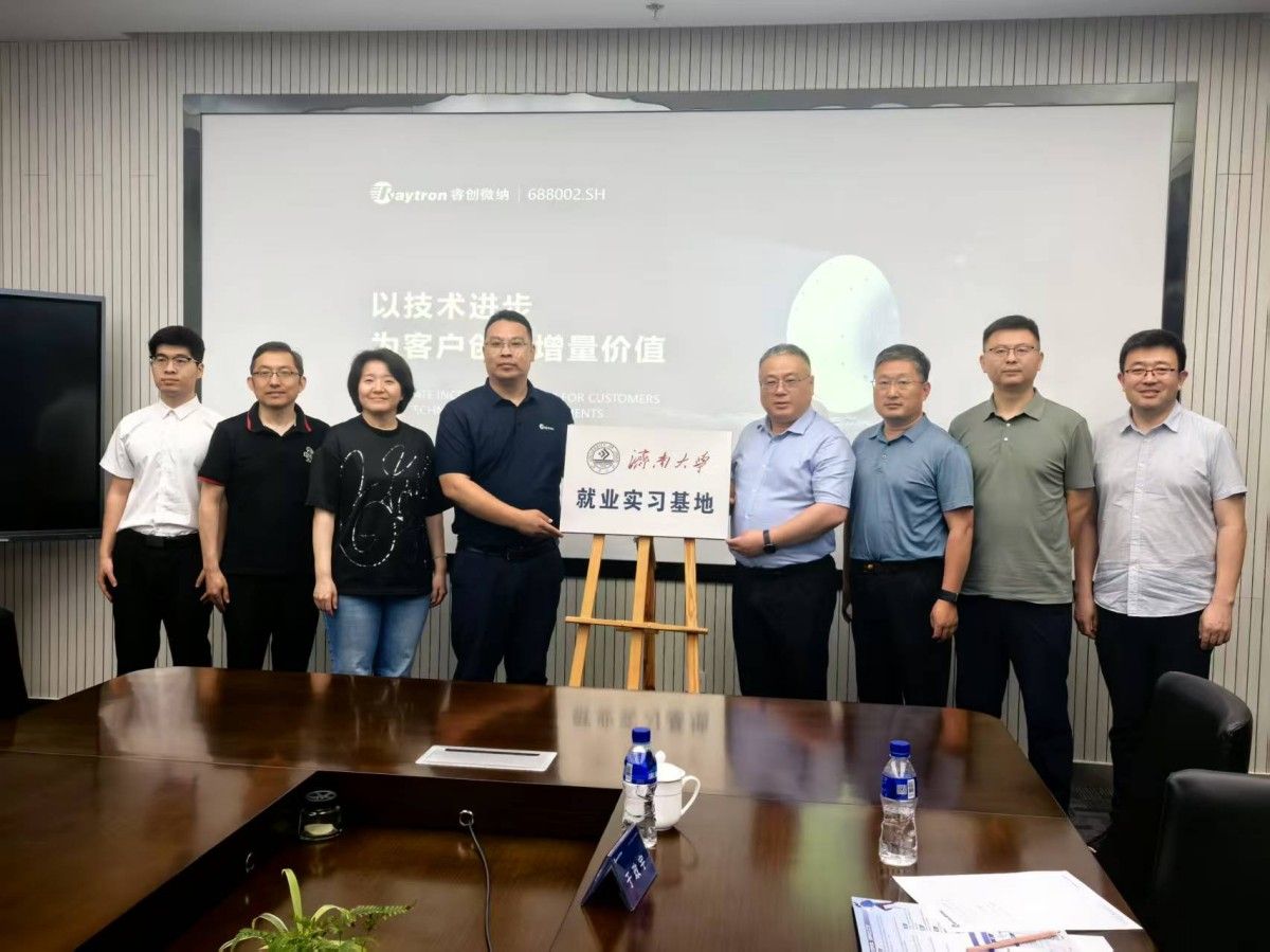 在烟台,黄加栋一行参观考察了烟台睿创微纳技术股份有限公司在红外等多维感知技术领域的系列产品。座谈会上,双方聚焦光电感知领域的技术瓶颈与发展趋势进行深入交流,就共建就业实习基地、联合开展人才培养、共同申报科技项目等达成合作意向。黄加栋与烟台睿创微纳技术股份有限公司发展部总监刘强共同为“永利yl23411官网就业实习基地”揭牌。