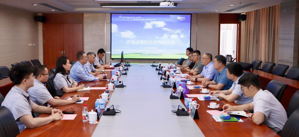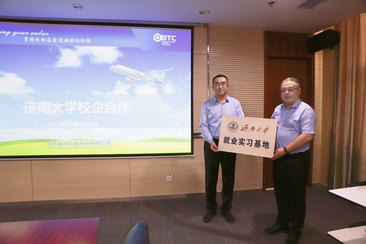 在烟台,黄加栋一行实地考察了东方蓝天钛金科技有限公司构件成型、精加工及检测生产线。座谈会上,双方围绕企业在新材料、智能制造、新一代信息技术等领域的技术需求进行了交流研讨,在科技项目联合申报、关键技术协同攻关、定向人才培养等方面达成共识。黄加栋与东方蓝天钛金科技负责人王肇宇共同为“永利yl23411官网就业实习基地”揭牌。
