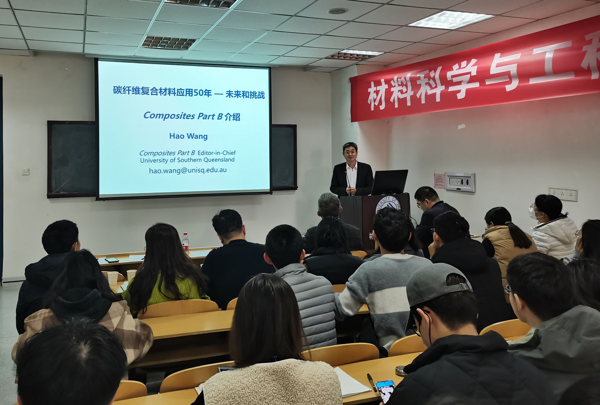 12月6日上午,澳大利亚南昆士兰大学教授、复合材料顶刊Composites Part B: Engineering杂志主编(IF=13.1)王浩教授应邀来山东省建筑材料制备与测试技术重点实验室和材料学院作了题为《碳纤维复合材料应用50年 - 未来展望及挑战》及《Composites Part B 期刊介绍和SCI文章写作》的学术报告。报告由泰山学者攀登计划专家程新教授主持,山东省建筑材料制备与测试技术重点实验室、材料学院相关专业师生百余人参与此次活动。