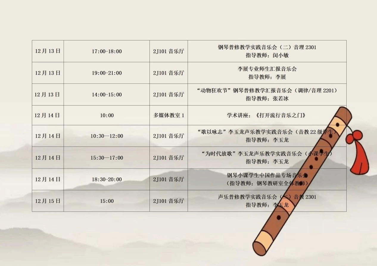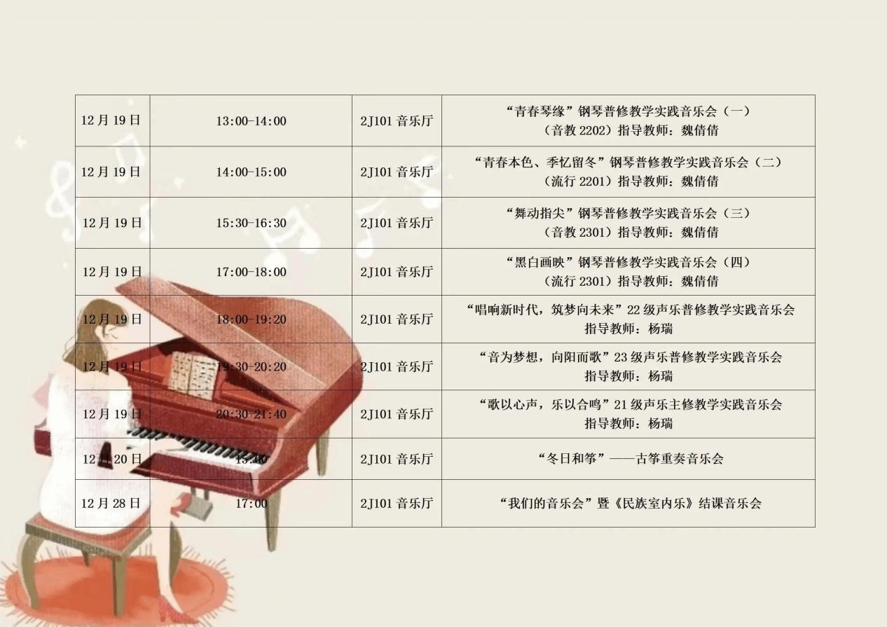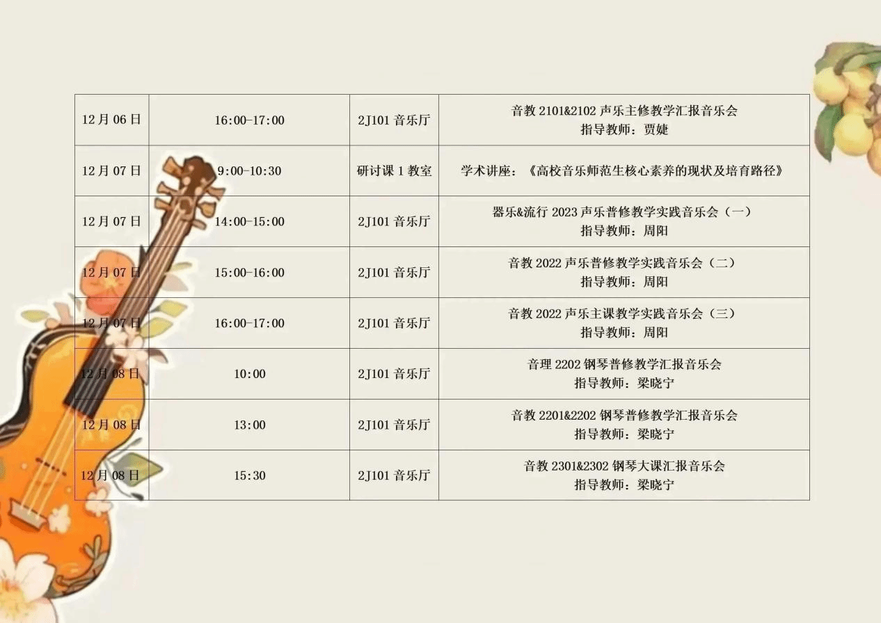 为持续推进教学建设,保障人才培养质量,强化专业艺术技能,音乐学院艺术实践周于十二月上旬启动,各项活动正在有条不紊地陆续开展。培养既有教学技能⼜有音乐表演能⼒的应⽤型⼈才是⾳乐学专业教学的重要方向,艺术实践周拟通过多⻆度、多形式的开展艺术实践,以“⼀专多能”为⼈才培养的核⼼,提⾼学⽣教学技能、音乐表演、艺术理论与技术以及⾼雅的审美能⼒ ,了解当下的美育开展现状与具体实施形式,开阔学⽣的知识视野,并使其艺术素养得到良好发展。(注:各项活动时间如有调整,以具体通知或海报为准。)