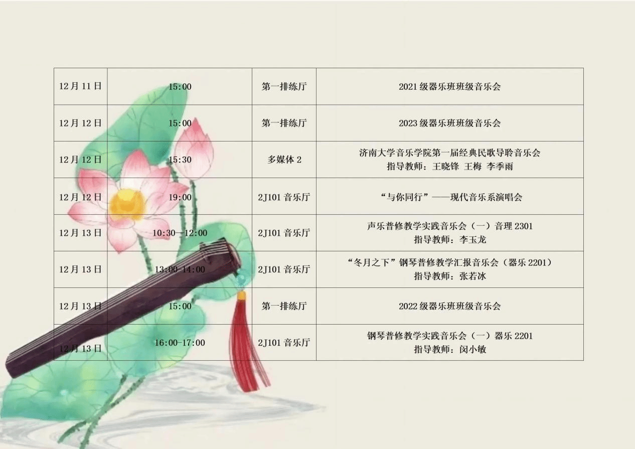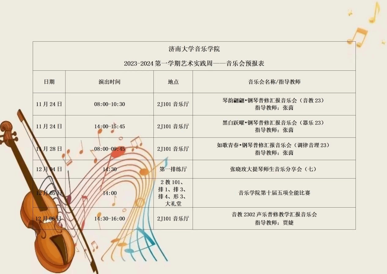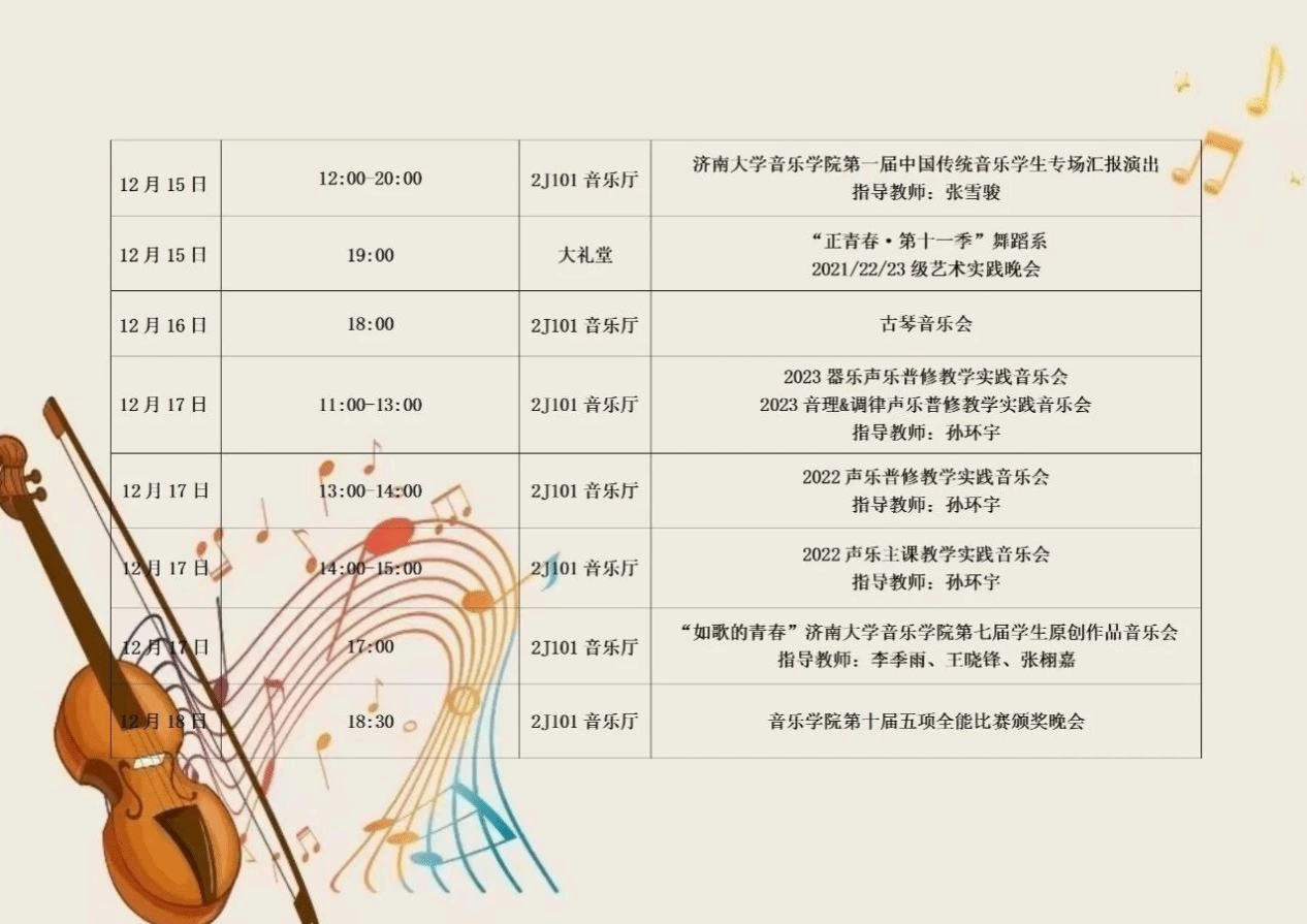 为持续推进教学建设,保障人才培养质量,强化专业艺术技能,音乐学院艺术实践周于十二月上旬启动,各项活动正在有条不紊地陆续开展。培养既有教学技能⼜有音乐表演能⼒的应⽤型⼈才是⾳乐学专业教学的重要方向,艺术实践周拟通过多⻆度、多形式的开展艺术实践,以“⼀专多能”为⼈才培养的核⼼,提⾼学⽣教学技能、音乐表演、艺术理论与技术以及⾼雅的审美能⼒ ,了解当下的美育开展现状与具体实施形式,开阔学⽣的知识视野,并使其艺术素养得到良好发展。(注:各项活动时间如有调整,以具体通知或海报为准。)