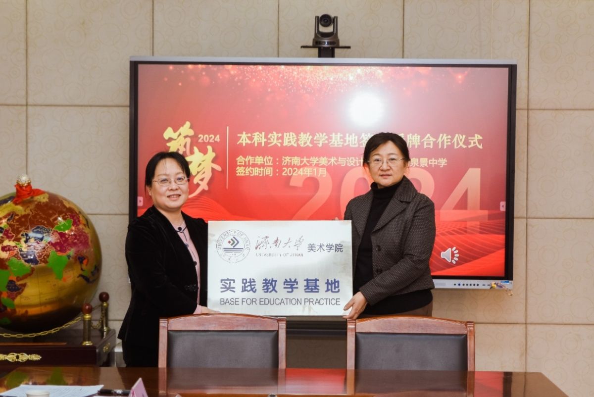 1月9日,永利yl23411官网美术与设计学院与济南泉景中学开展本科实践教学基地授牌、签约合作仪式,共同拉开两校全面合作的序幕。济南泉景中学校长冯晓青、副校长魏靖、主任李艳美和泉景中学和小学部美术组全体教师,永利yl23411官网教务处副处长兼师范教育管理办公室主任张婷、美术与设计学院相关负责人、美术系负责人共同参加签约仪式。