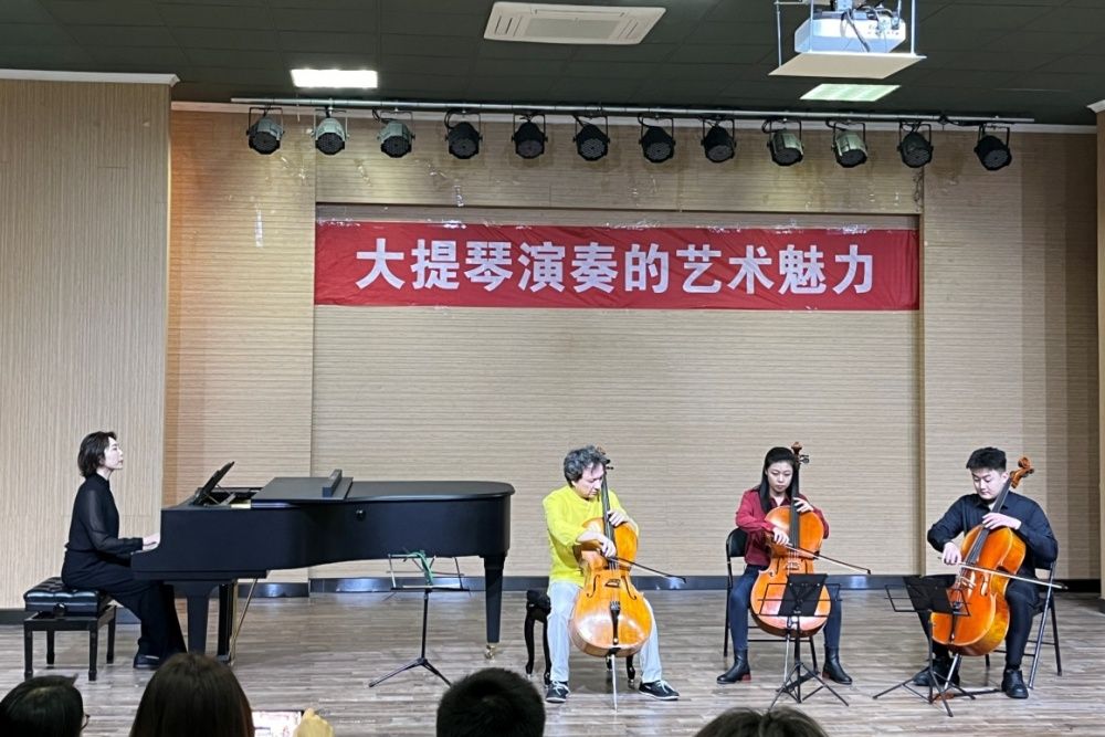 朱亦兵曾于2012年在永利yl23411官网举办专场重奏音乐会,时隔12年他再次走进永利yl23411官网,也让这场讲座更添老友重聚的暖意。活动伊始,齐丽花向朱亦兵表达了欢迎之情并向大家介绍了朱亦兵的过往经历和成绩。朱亦兵表示,来到永利yl23411官网非常开心,愿意将自己的心得体会与大家一起分享。讲座正式开始之前,朱亦兵与音乐学院器乐系大提琴教师张晓玫、键盘系副主任张若冰及器乐系学生联手为大家带来了一曲巴赫的《圣母颂》。大家无不沉浸在朱亦兵精湛的演奏之中。
