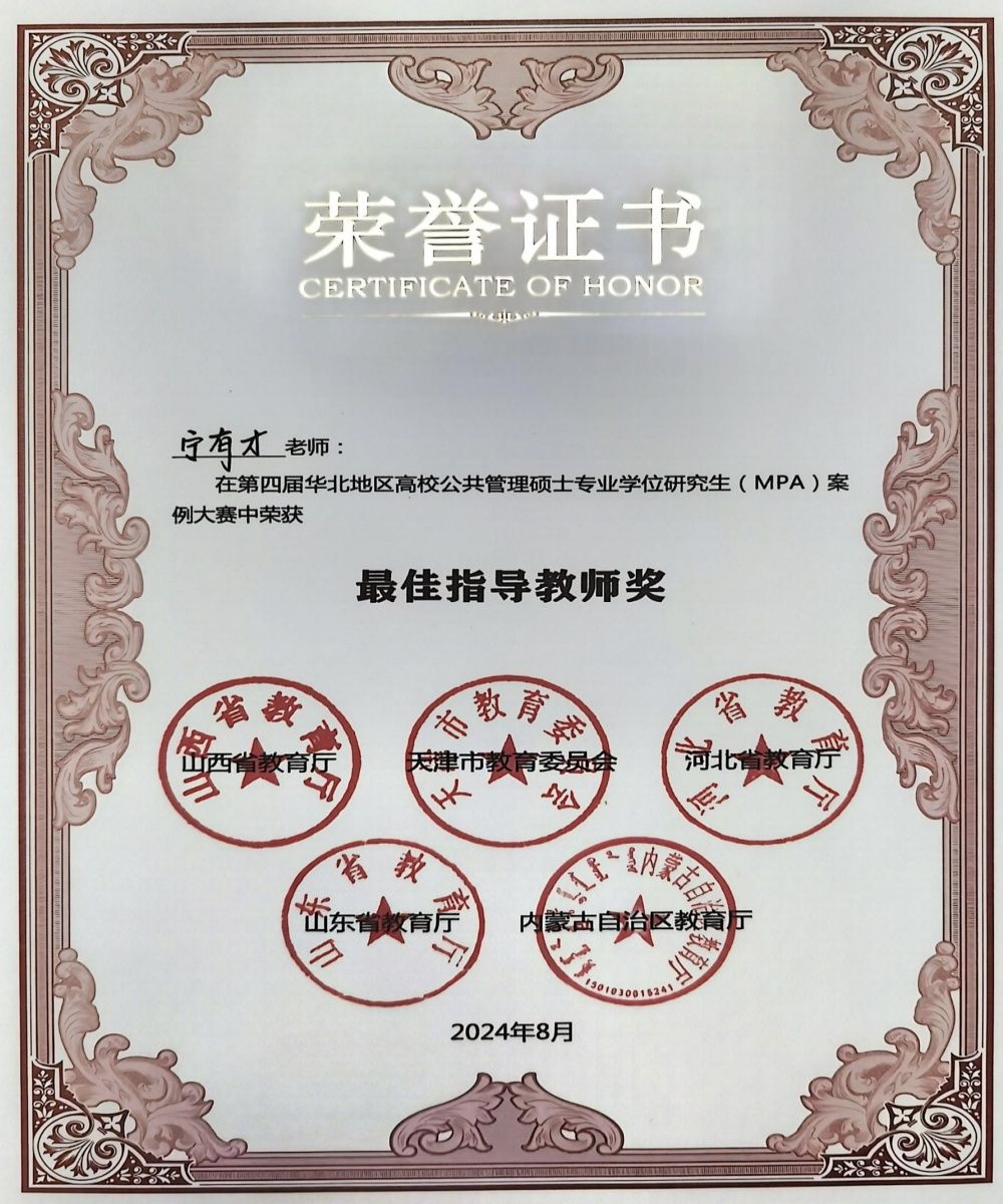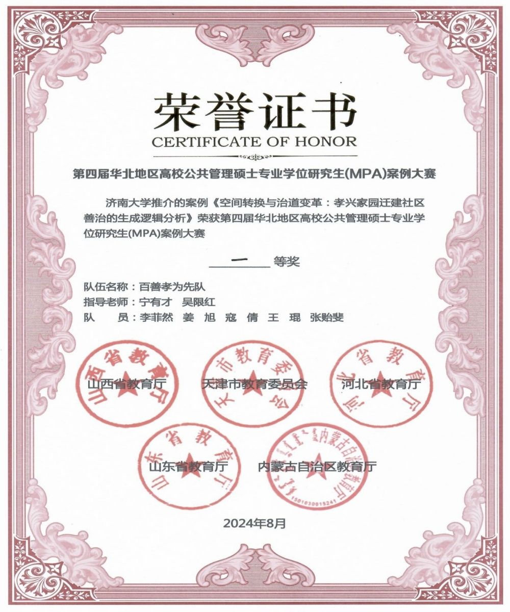 本次大赛共有来自山西、天津、山东、河北、内蒙古五个省(市、自治区)高等院校的六十支队伍参加。由永利政法学院教师宁有才、吴限红指导,公共管理学2023级研究生李菲然(队长)、公共管理(MPA)2022级研究生姜旭、王琨、寇倩、张贻斐组成的“百善孝为先”队代表永利yl23411官网参赛,并提交参赛案例《空间转换与治道变革:孝兴家园迁建社区善治的生成逻辑分析》。