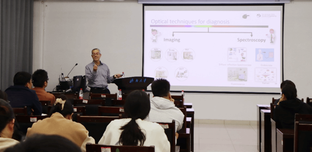 Dror Fixler教授以“纳米光子学及其生物应用”为题做了精彩的学术报告。他阐述了用纳米光子学工具重建参与介质光学性质的理论和实践模型,介绍了Dror Fixler实验室使用扩散反射剖面、添加纳米颗粒作为对比剂、全散射剖面及其等径长点或迭代相位多次测量重建技术来探测组织特性,利用荧光寿命和荧光各向异性等光学参数的变化来探测多种生物环境,讲解了金纳米颗粒(球体和棒状)、有机纳米颗粒以及类组织体模等化学和生物材料的设计制备,以及在癌症和动脉硬化等疾病诊断、不同生理参数、可视化酶活性和早期细胞突变检测等各方面的应用。报告深入浅出,使师生们获益良多。报告会后,Fixler教授与参会师生进行了深入交流,并耐心解答了大家的提问。