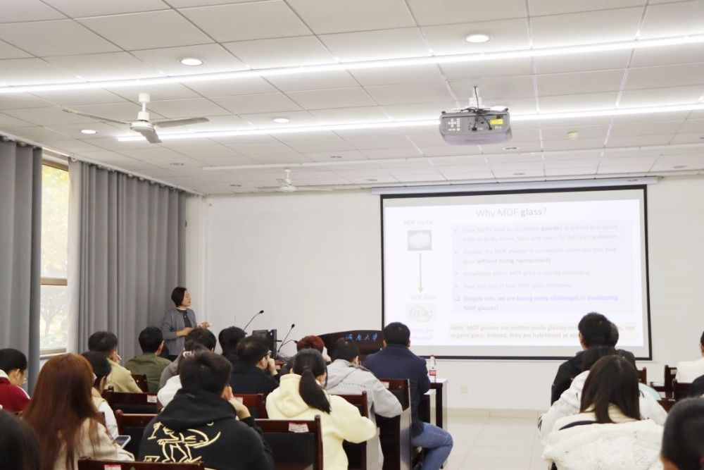张艳飞教授以“玻璃化金属有机框架(MOF)及其在锂离子电池中的应用”为题作了精彩的学术报告,介绍了MOF玻璃特异的微观无序结构及其优异的电化学性能。在报告中,张艳飞教授对MOF晶体的玻璃化形成过程、MOF玻璃的结构特征及其在锂离子电池负极中的应用进行了深入的讨论,讲述了对MOF晶体、无定形态和MOF玻璃作为锂离子电池负极材料的电化学性能与微观结构之间的关系的系统表征,由此探讨了MOF玻璃负极在充放电过程中微观结构的演变规律及其对性能提升的结构根源。最后,她对MOF玻璃的研究进行了总结,并展望了其未来的发展方向,期望对MOF玻璃的结构、性能和功能之间的相关性进行更深入地研究,探索MOF玻璃在气体吸附、分离、催化、传感等领域的应用潜力,推动其在新兴领域的发展。