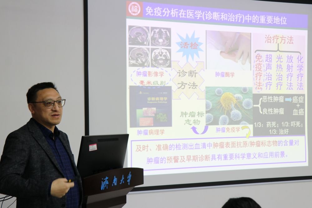 唐点平教授以“免疫分析新方法和新技术”为题,介绍了其课题组近年来在免疫分析领域的成果。唐点平教授指出,全球癌症新发病例数量呈逐年上升趋势,癌症的早期诊断意义重大,而免疫分析在医学诊疗过程中占据关键地位。基于此,唐点平教授课题组对经典免疫分析模式中的抗体标记策略与信号转导模式予以创新,成功研制出多种便携式柔性生物传感器件,并构建了具备无线蓝牙监测功能的柔性传感器,应用于智慧医疗诊断领域。围绕疾病早期诊断以及柔性传感器件制备等相关问题,化学化工学院师生与唐点平教授展开了深入的研讨交流。