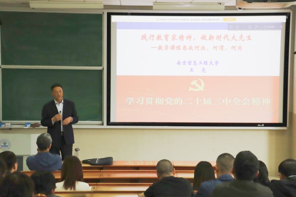 为贯彻落实立德树人根本任务,深入推动我院“课程思政”建设走深走实,全面提升人才培养质量,5月6日下午,南京信息工程大学原党委副书记、副校长,博士生导师王尧教授来院为师生作题为“弘扬教育家精神,做新时代大先生——数学课程思政何位、何谓、何为”的专题报告。学院全体领导班子成员及全体教职工参加会议,会议由学院党委书记崔英静主持。