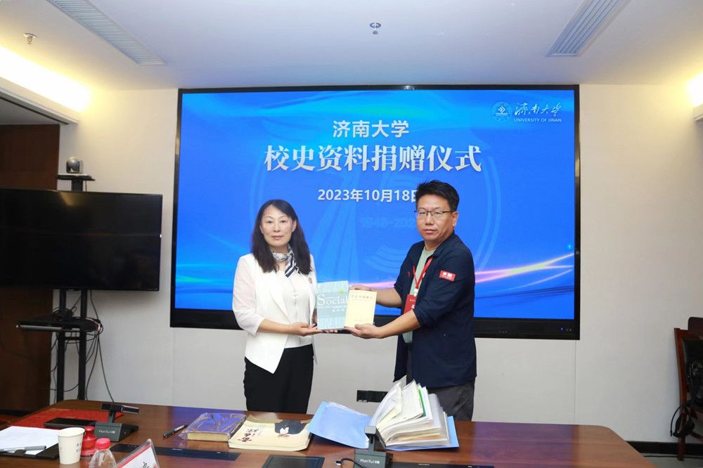 仪式上,王保瑛校友介绍了这次捐赠物品的基本情况,深情回忆了自己在济大求学的经历和生活点滴,讲述了与母校的不解情缘。多年来,王保瑛结合自己收藏的有关史料文献,深入研究,初步梳理出民政部济南民政学校校史概要,此次,他将收藏整理的校史概要及相关史料文献无偿捐赠给母校,以供展示和研究。