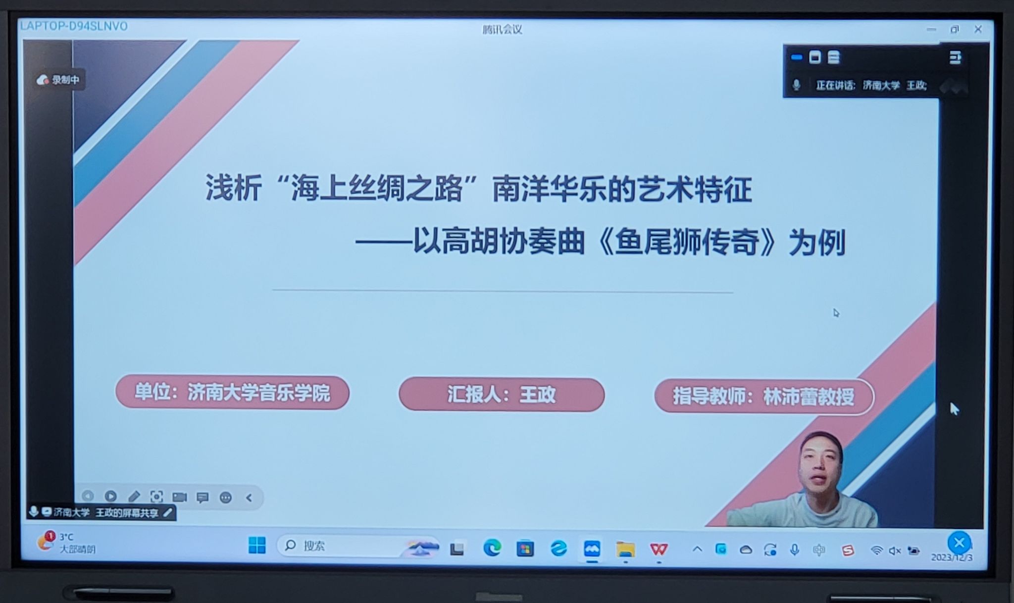 其次,在分会场我院四位硕士研究生进行线下发言。2023级音乐教育方向研究生蔡依檀对其论文《音乐在“南洋”海上丝绸之路经济交流中的角色与影响》进行讲解,论述音乐在海上丝绸之路经济交流中扮演了促进贸易、加强文化交流和增进相互理解的角色。2022级音乐教育方向研究生王子仪以钢琴改编曲《走马随想曲》的演奏技巧与音乐诠释为切入点,分析与归纳传统音乐古谱与钢琴音乐的共通点,探索更多民族元素运用于我国海上丝绸之路钢琴音乐创作的有效路径。2023级音乐教育方向研究生李泽华以扬琴与钢琴的音乐碰撞及融合为主要创新点,探讨扬琴元素在钢琴改编音乐中的运用,如何用不同的创作技法呈现多元民族乐器的音色与技巧,探索中西音乐融合的有效路径,彰显民族音乐文化在钢琴演奏中的实践价值。最后,2023级音乐教育方向研究生郭春丽以《海上丝绸之路音乐文化交流与福建南音三弦的共生与发展》为论文题目,从福建南音与其它国家的历史渊源,以及福建南音三弦在日本的传承发展进行阐述。