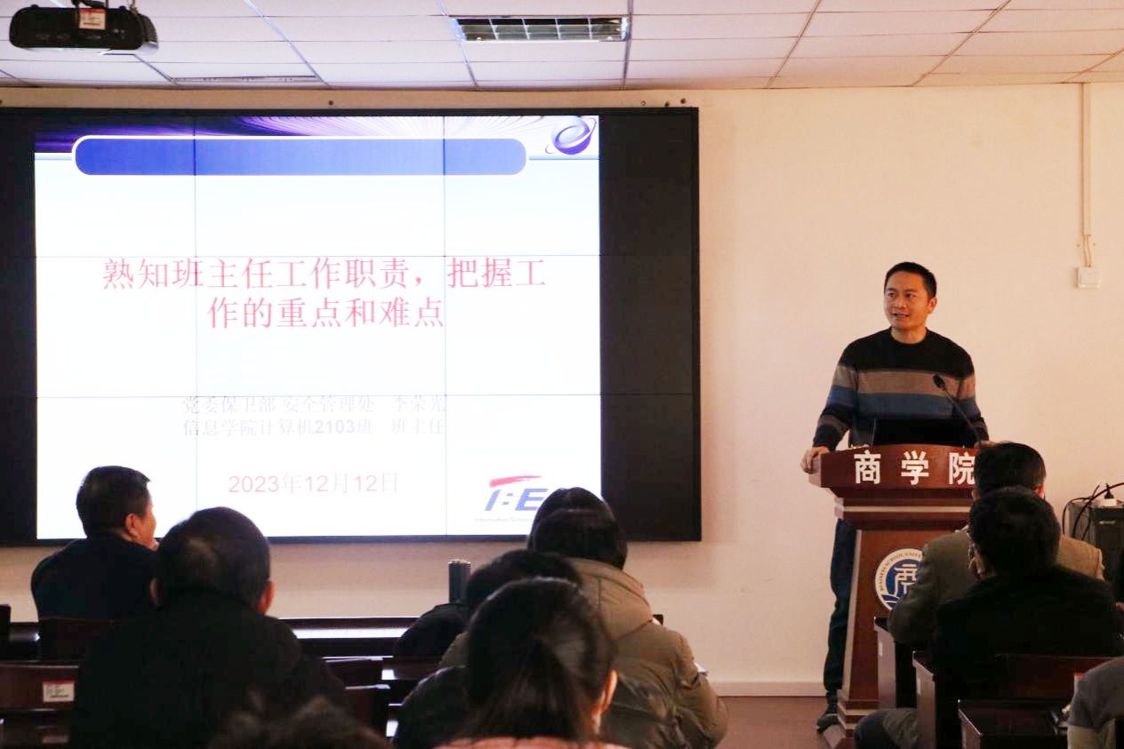 永利yl23411官网优秀班主任、党委保卫部部长李荣光结合自己多年班主任工作经历,深入浅出的讲述了学生工作理念及思路、班级工作面临的新形势和存在的常见问题、不同年级的工作重点和难点、困难群体关注与帮扶等方面,着重强调学生安全底线的重要性,为班级学生工作提供指导。