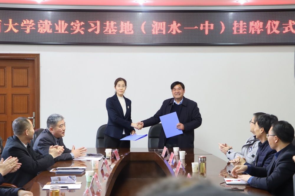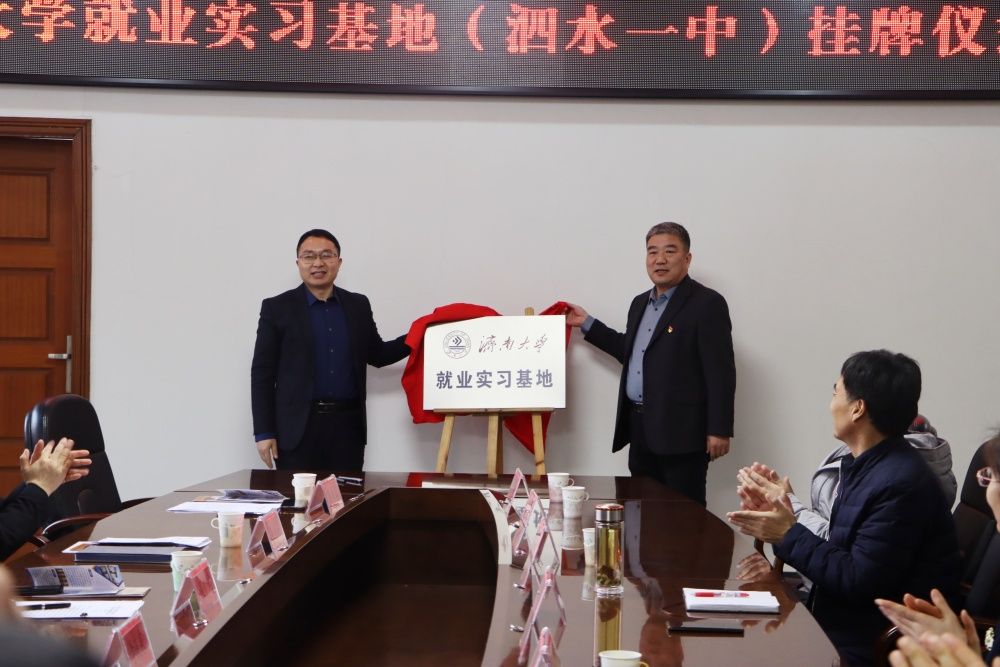 随后,泗水一中校长刘延标和外国语学院党委副书记、副院长郭英作为代表签订毕业生就业基地协议书。泗水一中党委书记蔡秀喜与外国语学院院长宋庆伟共同为“永利yl23411官网就业实习基地”揭牌。