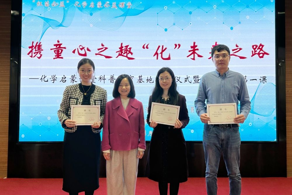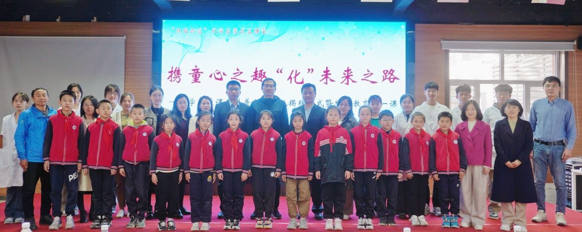 随后,贺铭与张峰共同为党建共建基地和化学启蒙课堂科普教育基地揭牌。严婷为三位附属小学校外辅导教师颁发聘书。