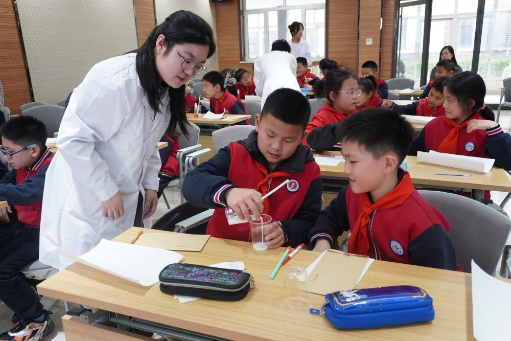 仪式结束后,志愿服务团队成员开展了《看不见的信》化学启蒙科普教育第一课,通过运用生活中常见的液体在特定的条件下能够显现出神秘的文字信息,大大激发了孩子们对化学的好奇心、想象力、探求欲,也让他们深刻感受到了化学的神奇与魅力。团队成员以化学趣味性实验为契机,将深奥的科学知识以生动直观的形式展现给孩子们,引导他们通过亲身实践去探索化学的奥秘。