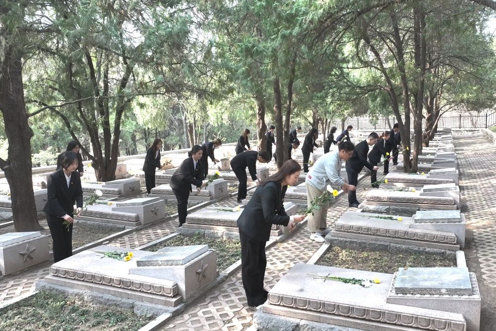革命烈士纪念塔前静谧肃穆,烈士墓碑整齐排列。在烈士墓前,大家整齐列队,依次献上手中的鲜花,表达对烈士们的深切缅怀和崇高敬意。一朵朵鲜花寄托着无尽的哀思和敬仰,也传递着新时代青年继承先烈遗志、砥砺前行的坚定信念。