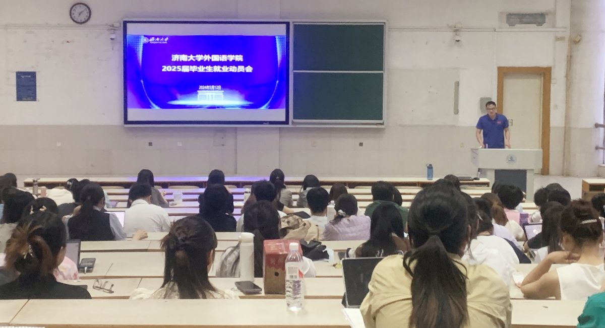 为进一步推动学院2025届本科毕业生考研及就业指导工作,帮助同学们清晰认识毕业就业现状,鼓励同学们提前做好升学就业准备,5月13日,外国语学院在第二教学楼201教室召开了2025届本科毕业生就业动员会,学院副处级组织员李春海、团委书记吴杨洋,2021级全体学生参会。会议由辅导员王华伟主持。