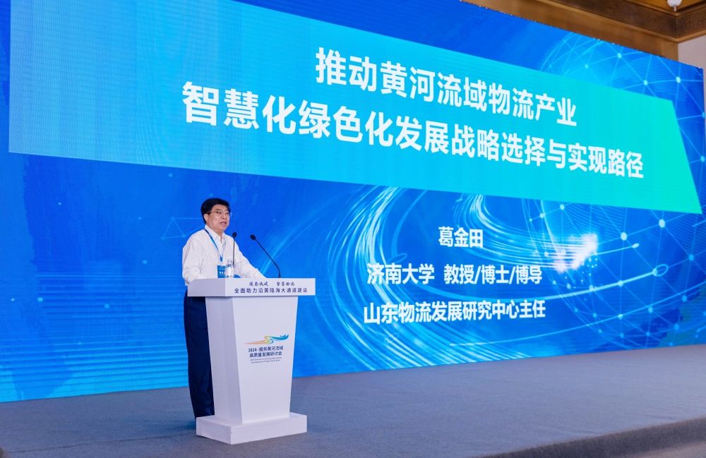 5月25日,由中国物流与采购联合会、山东省港口集团主办的“共建沿黄陆海大通道 融入全国统一大市场——2024·服务黄河流域高质量发展研讨会”在济南召开,来自沿黄九省区政府部门、行业协会、海关、铁路、港口及重点物流企业的代表参加会议。会议围绕共建沿黄陆海大通道、共筑降本增效新模式、共促绿色智慧新生态、共创互利共赢新局面等主题展开研讨,旨在深入贯彻落实习近平总书记近日在山东考察时提出的重要指示要求,推动沿黄省区互联互通、深化合作,更好的服务实体经济。永利yl23411官网山东物流发展研究中心主任葛金田教授应邀参会,并作《推动黄河流域物流产业智慧化绿色化发展的战略选择与实现路径》的学术报告。