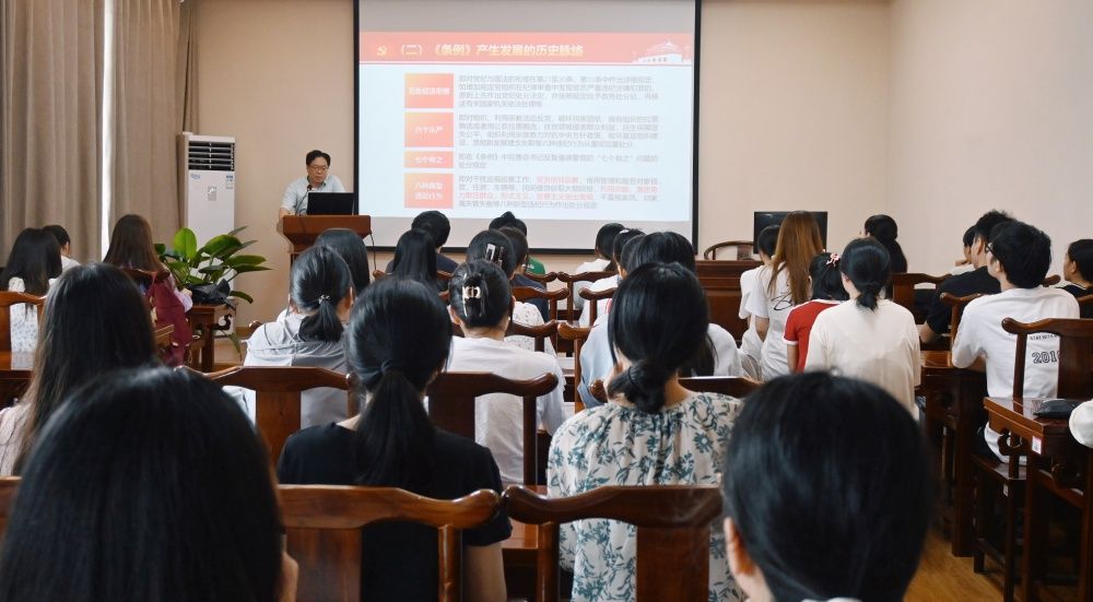 为推进党纪学习教育走深走实,教育引导青年学生学纪、知纪、明纪、守纪, 6月14日,文学院党委书记董海军为学生党员讲授党纪学习教育专题党课。学院各学生党支部书记、学生党员参加学习。