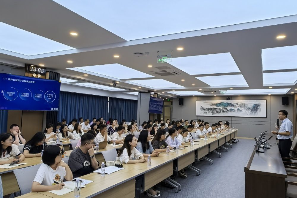 工作交流环节,党委学生工作部(处) 武装部部(处)长卢旺代表学校对贵州省高校辅导员一行表示热烈欢迎,介绍了永利的基本办学情况与近年来永利学生思政工作思路及工作成果。他表示,学校围绕立德树人根本任务,以“时代新人铸魂工程”为牵引,以“高质量人才培养工程”为依托,聚焦聚力“四维八航”,加强提升“七力五度”,构建学生思政教育“1249”工作体系,推进信仰领航、梦想启航、学业引航、生涯导航、家访助航、资助护航、心理稳航、就业远航“八航”工程,希望本次活动能够为两地的教育交流搭建桥梁,更好地服务于辅导员队伍建设和学生成长成才。随后,党委学生工作部(处) 武装部副部(处)长张晶以“高校生涯教育一体化模式的思考与实践”作生涯教育专题报告,从探寻高校生涯教育的逻辑原点、打造高校生涯教育一体化模型、推动高校生涯教育一体化实践三个部分分享了永利的生涯特色做法,与贵州省高校辅导员们进行了深入探讨与交流。