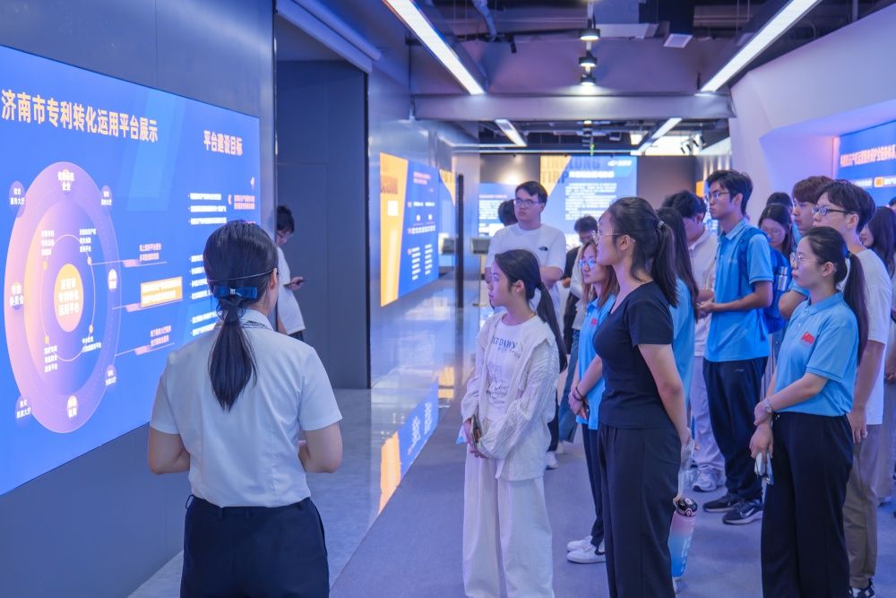 在国家大学科技园,师生一行共同参观了国家大学科技园未来产业创新平台,听取了讲解员对整个未来产业平台展馆的情况介绍,包括济南市专利转化应用平台、市中区十大产业链群专利导航分析等,了解园区在助力山东改造传统产业、壮大新兴产业、塑造高质量发展新优势方面所取得的成效。最后工作人员还向同学们介绍了园区的布局及企业的入驻情况,并鼓励大家将来进入园区优秀企业单位实习、工作。